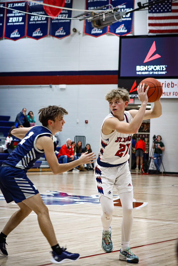 Emmitt Peters, a senior combo shooting guard / point guard for St. James Academy, enters his final year for the Thunder with some lofty goals, “As a team, we’d definitely like to win the EKL and go on a deep state tournament run. Personally, I would like to earn MVP of the EKL as well as First Team All-State.” As impressive as those targets may seem, when one considers Peters’ past contributions, those goals appear to be within reach.